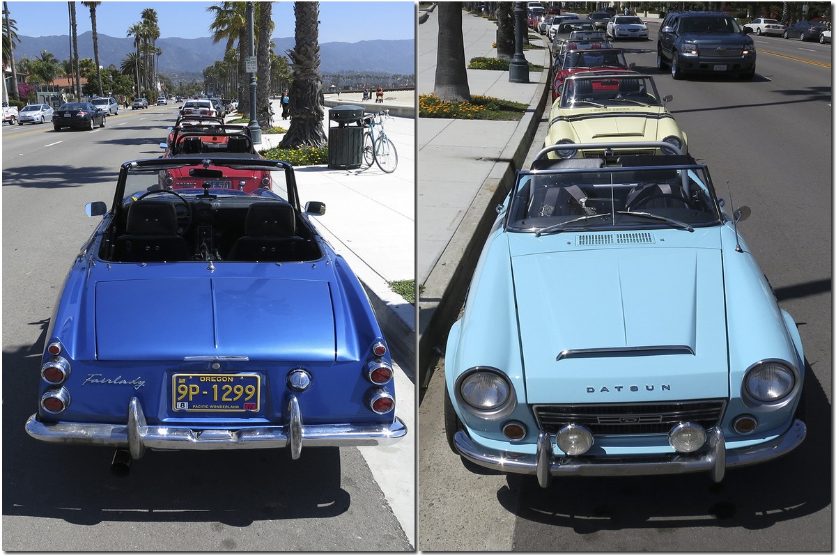 As I was cycling along the path down near the harbor I spied ten Datsun Fair Ladies parked along Cabrillo Boulevard. I remember when these were first brought into the United States back in the mid 60’s. Seeing them again reminded me what nice sporty cars they were, and remain. Seven of the ten had Oregon plates with two from California and one British Columbia. Click on the image above to see a larger version then click forward for two more montages, one displaying “Fair Lady” logos to advantage.